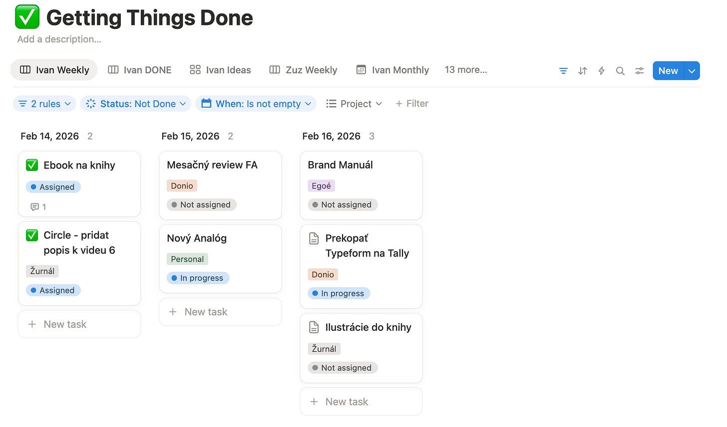 1. Otvorím Notion — pozriem si, čo je na dnešok. Čo prišlo z recurring úloh, čo sa priblížilo z deadlinov.
