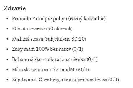 Predtým som si ciele pre jednotlivé oblasti rozmenil na drobné a ku každému som si napísal ako ho budem vyhodnocovať. Napríklad takto: